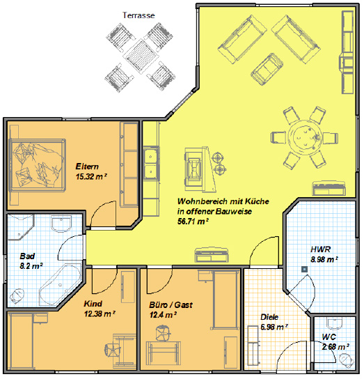 Modern interpretiertes Wohnen auf einer Ebene, kein Treppensteigen, kein Platzverlust durch große Flure.